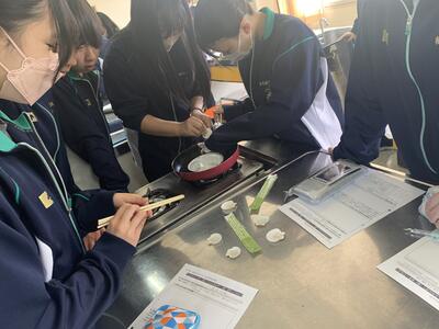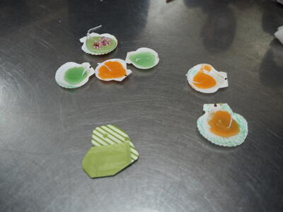 修学旅行での観光大使活動に向けて,シェルキャンドルを作成しています。