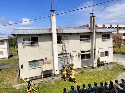 避難訓練を終えた後,消防の方の救助訓練を実際に見学する機会をもらえました。