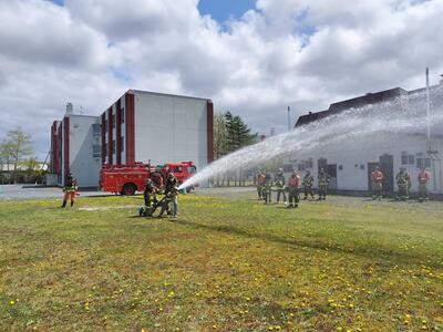 そして放水体験。実際の圧力より低いそうで・・・。それでも勢いよく水が飛んでいきます。