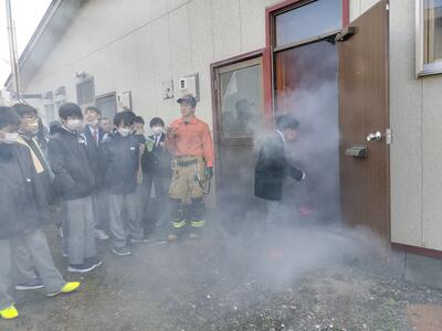 結構な煙で,何も見えないです。本当の火災の際は真っ黒な煙だそうで,もっと見えないそうです。