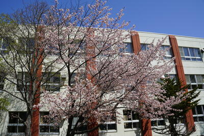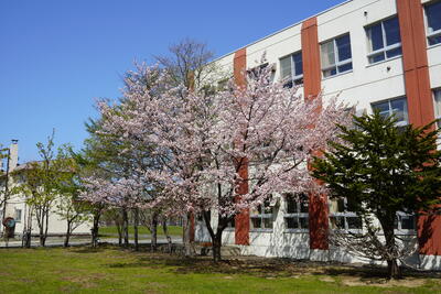 校舎の中にある桜が満開です。きれいな桜色と木の形もきれいです。