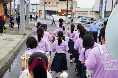 副港市場で団体交流演奏し,北門神社まで行進しました。