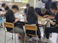 潮中生の一人一人が折り鶴にそれぞれの平和への想いを込めて、仲間と協力が輝いた6時間目でした。